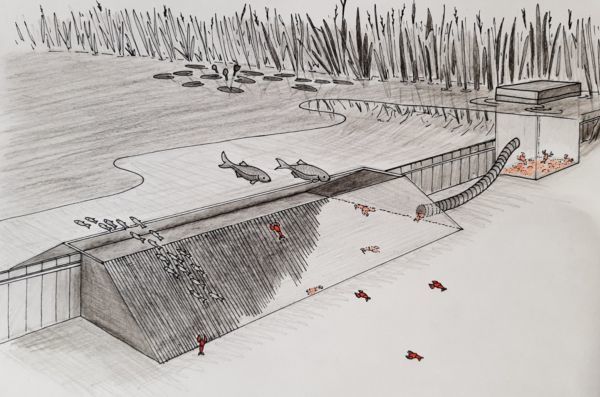 Schematische weergave kreeftengoot. De kreeften worden vanuit de goot naar de opvangbak begeleid. ©ATKB