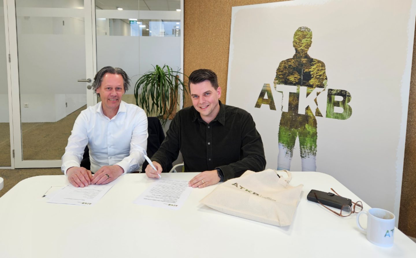 Foto: Ruud Vink (rechts) en commercieel directeur Noël Boom ondertekenen Ruuds arbeidscontact bij ATKB